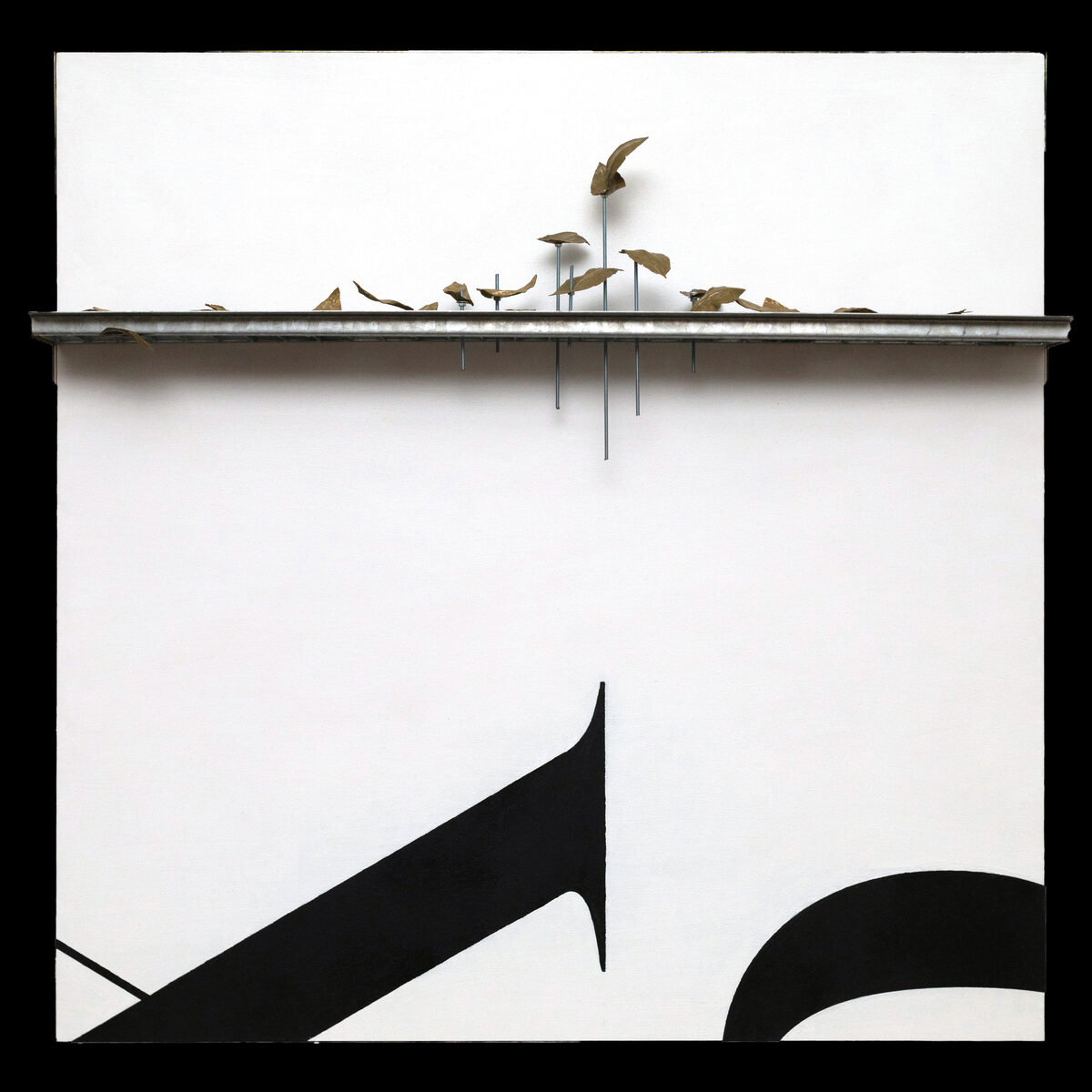 Работа, название которой можно перевести как «острый на язык» (дословно, «языкастый как акулий плавник»), представляет собой листья из латуни, поднятые в воздух ударом буквы. Перед нами сюрреалистическая сцена взаимодействия природы и текста. Здесь сталкиваются человеческий порядок (шрифт, вентиляционная решетка, квадрат холста) и живые формы листьев, их свободное парение в воздухе, впрочем, грубо зафиксированное на резьбовые шпильки. Это разнообразие фактур при общем стилевом единстве материалов создает впечатляющее произведение волнующее мысль и привлекающее взгляд.