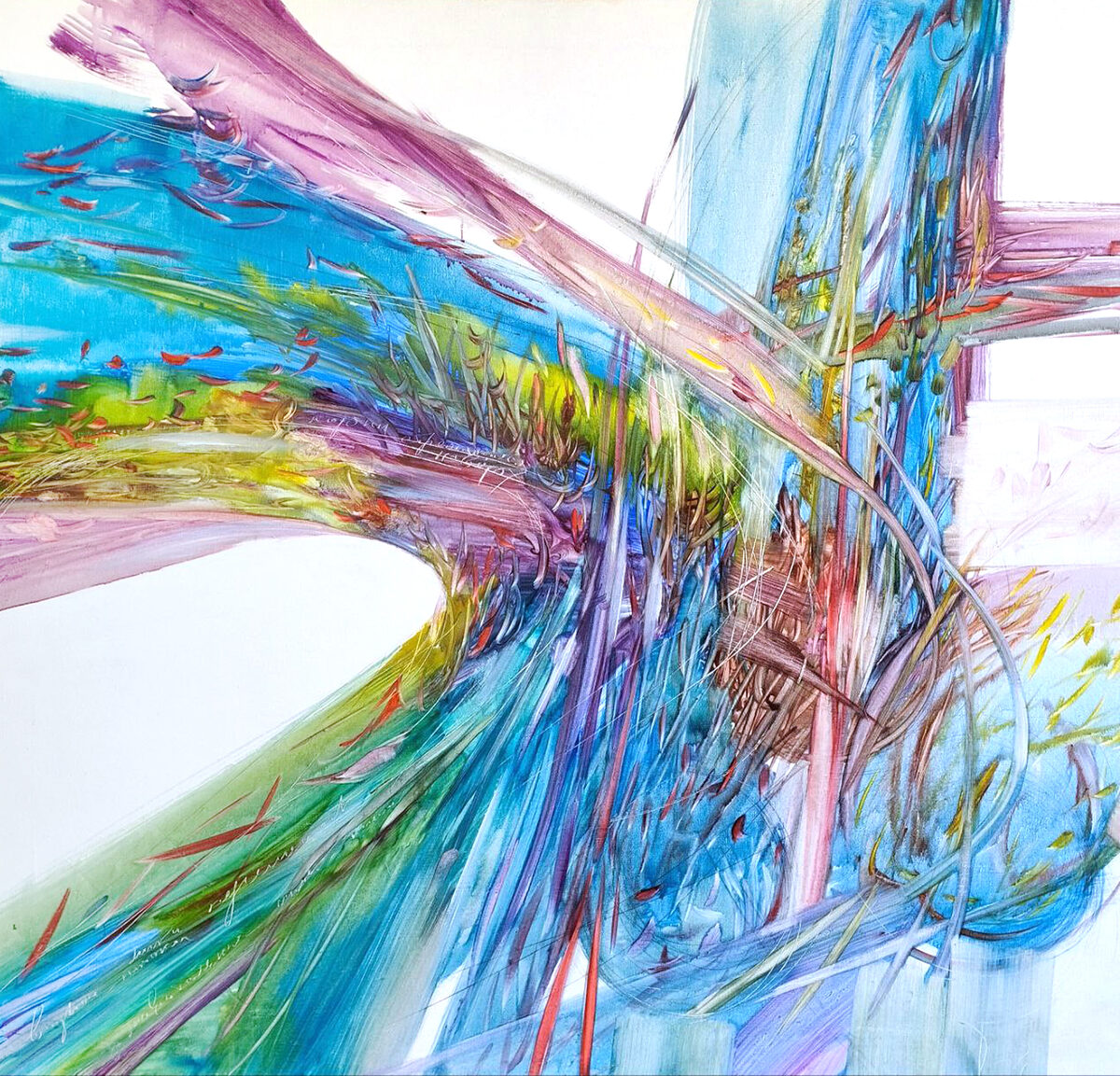 «Весенние токи» — особенное полотно, в котором цветочно-цветущие струи группируются в динамическую композицию, словно эмоциональные взмахи широкой кистью. Жестовое начало этой картины напоминает о французской школе абстракции Пьера Сулажа и Ханса Хартунга. Но если европейские мастера обычно наносили такие экспрессивные полосы монохромно, то Богусонова разливает их всеми цветами майского луга, смешанного с прозрачностью неба.