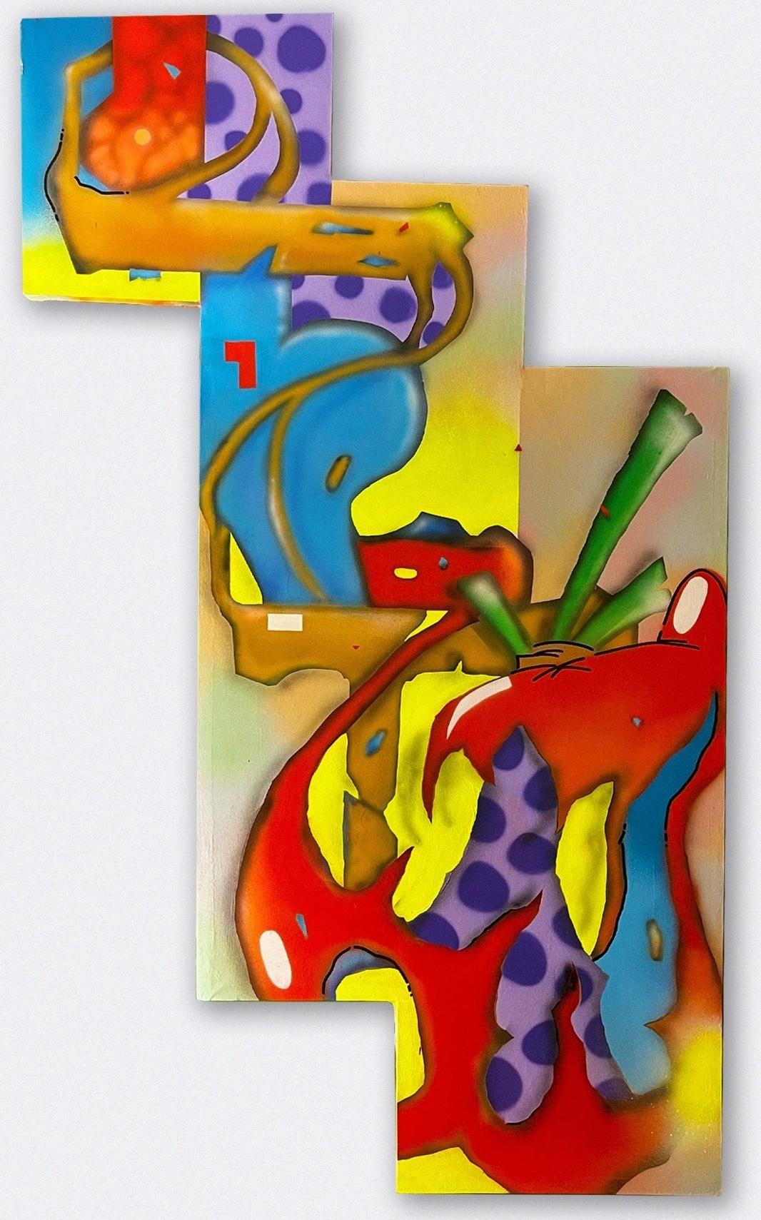 «Объект № 1» — работа из серии, в которой картина трансформируется в объект на стене, скульптурный, подвижный, напоминающий о проунах Эль Лисицкого или экспериментах художников постживописной абстракции. А тягучие, яркие живописные формы приобретают очертания натюрморта или анимированной заставки телевизионного шоу.