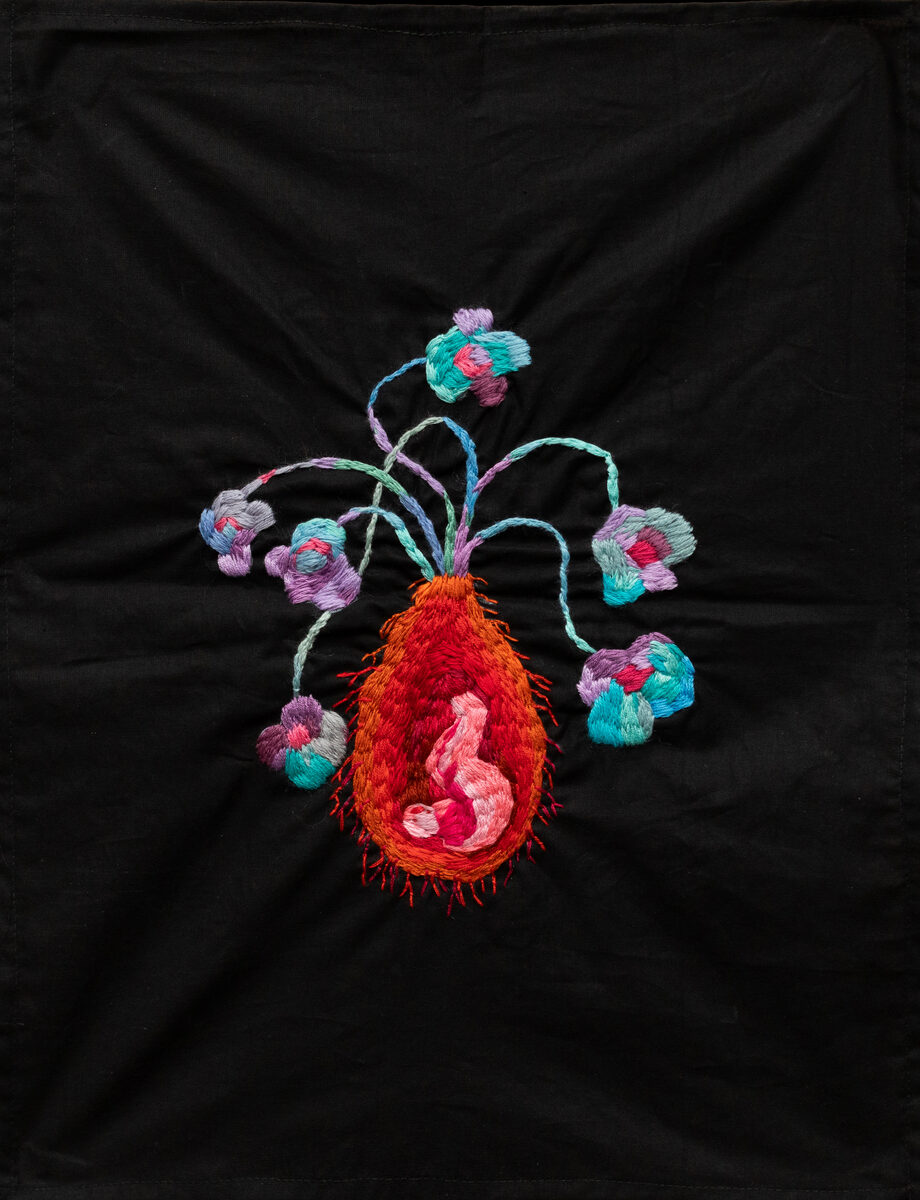 Каждой вышивке предшествуют акварельные работы, среди которых художница выбирает те, что будут наиболее удачно смотреться на ткани. Кропотливая работа иглой, обилие стежков делают ее произведения эмоционально насыщенными и почти телесными.