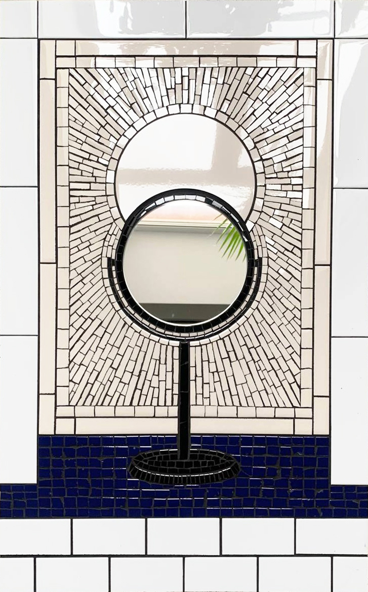 Во многих мозаиках прослеживается мотив окна. Зарешеченное окно, окошко кассы или алоэ на подоконнике. Работу «Зеркало» художник описывает так: «На первый взгляд это просто зеркало, которое стоит у меня на подоконнике. Глядя в него я подстригаю бороду. Однако сфера, восходящая полумесяцем с расходящимися от неё лучами, делает из бытового сюжета, некое, подобие алтаря перед которым должны совершаться тайные ритуалы, встречи с самим собой. Находясь перед алтарем, ты будто участвуешь в параде планет, затмевающих одна другую.