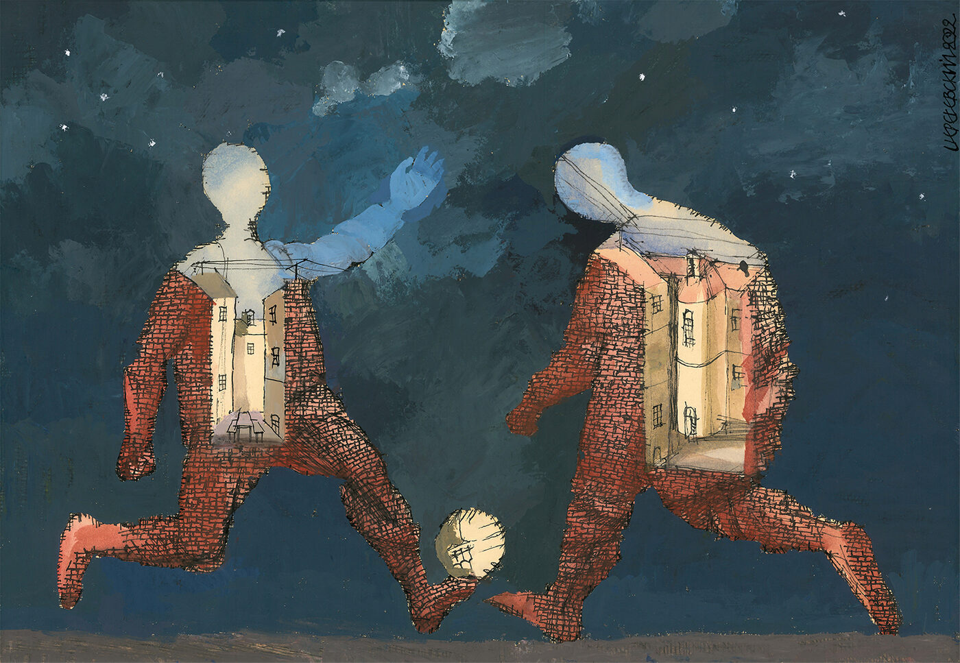 В графическом листе «Футбол» два подростка, играющих с мячом на фоне звездного неба, как будто несут внутри себя свои дворы. Работа для 74-летнего художника, очевидно, ностальгическая, и в то же время — философская. Каменный город помещается здесь внутрь бегущих, даже парящих футболистов, конкретика щербатых подъездов, с растворяющейся в космосе, словно созвездие рукой одного из игроков. Прошлое и будущее, материя и мечта — пересечения этих тем составляют сюжет волнующего своей интимностью произведения.