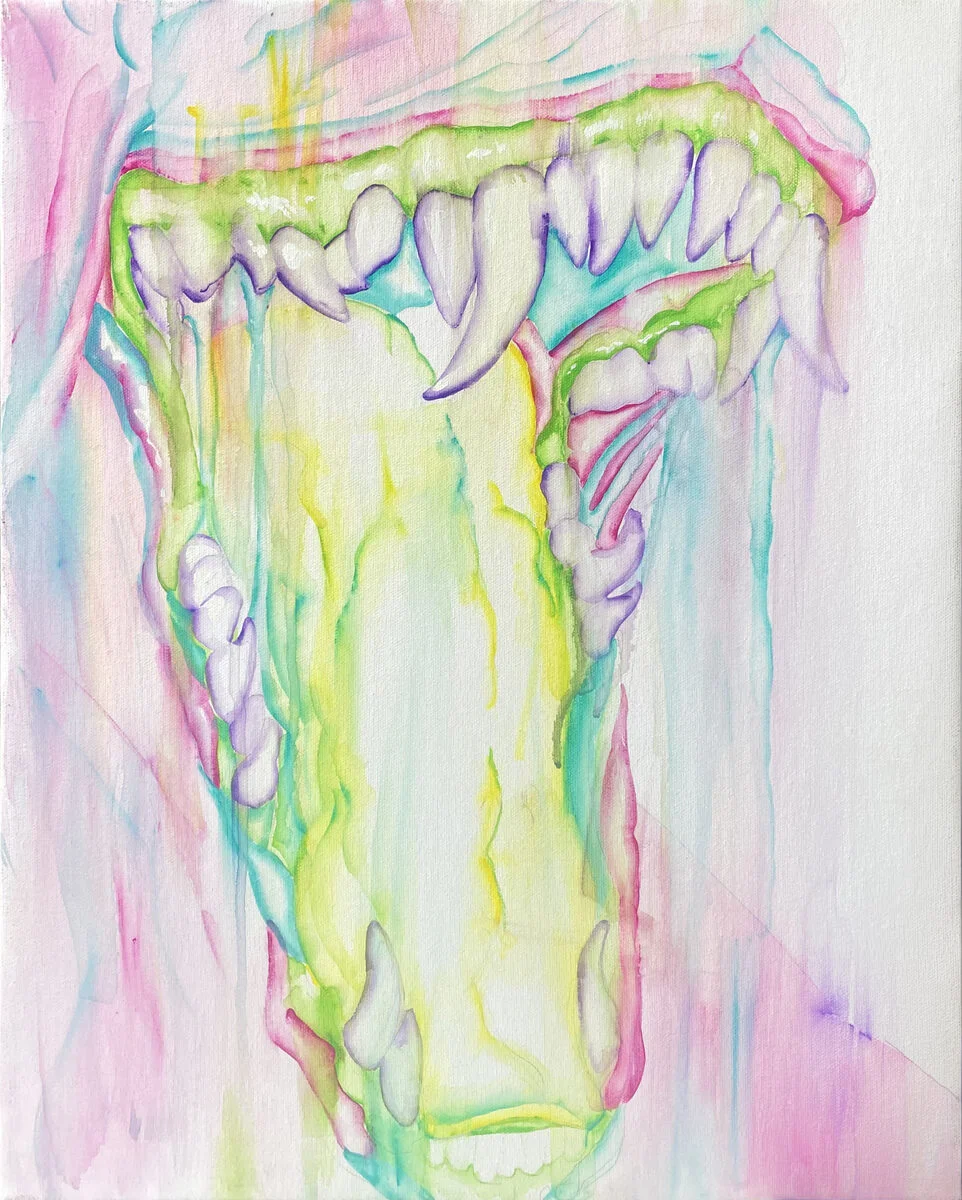 Работа из серии «Будь агрессивным: Клык» — яркое полотно, в котором запечатлено, словно на стоп-кадре, застывшая пасть. Завороженно можно наблюдать как блестят зубы, играя пестротой палитры детских пирожных: розовый, нежно-салатовый, фиолетовый, фисташковый. Зеленый язык превращается в водопад, а клыки в очертания скалистой пещеры. В этом рисунке смешались все детские мифы: и собака Баскервилей и зубная фея, и зубастики, и красавица и чудовище. Но все эти ниточки ведут к одному — к идее бесконечности и всепринятия детского воображения.