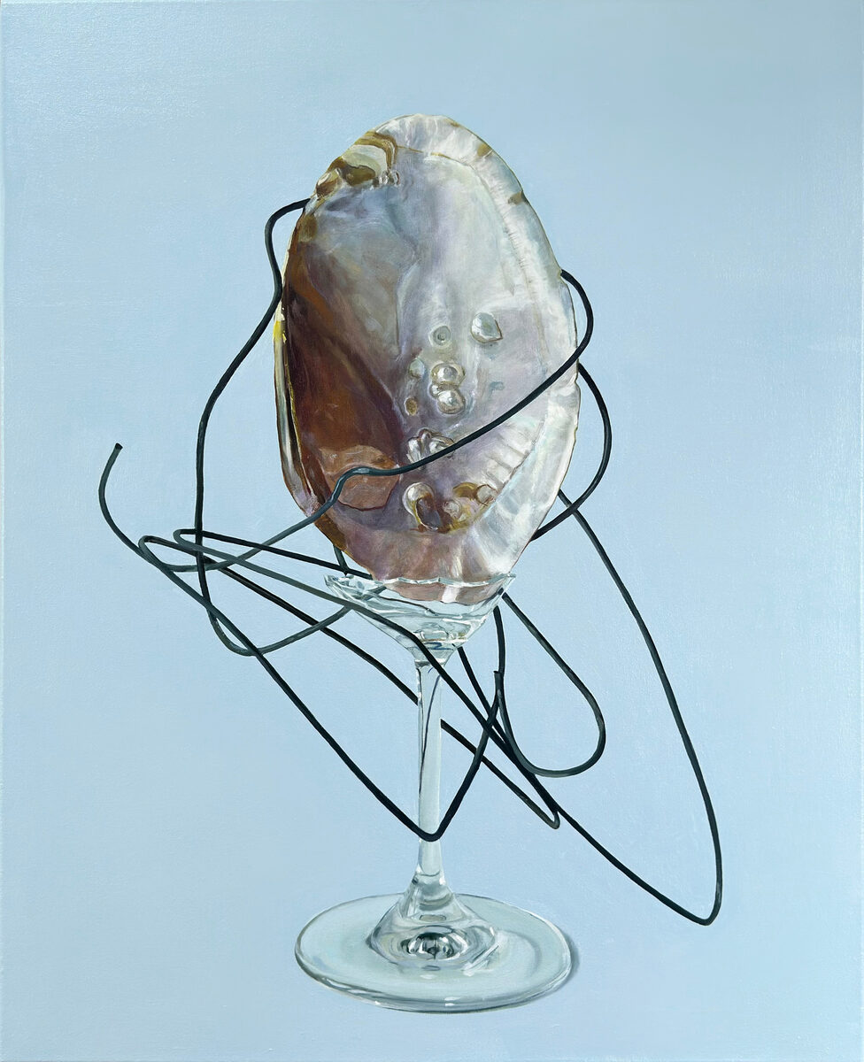 В работе «Путы I» на чистом голубоватом фоне художница изображает разбитый бокал, помещая на месте отсутствующей чаши раковину и опутывая композицию гнутой проволокой. Хрупкость тонкого стекла соседствует здесь с графичностью грубого металла, равного ей по тонкости, и переливающимся перламутром природного объекта. Чужеродные предметы вдруг образуют гармоничный ансамбль, как бы иллюстрируя парадоксальное единство искусства, индустрии и природы.