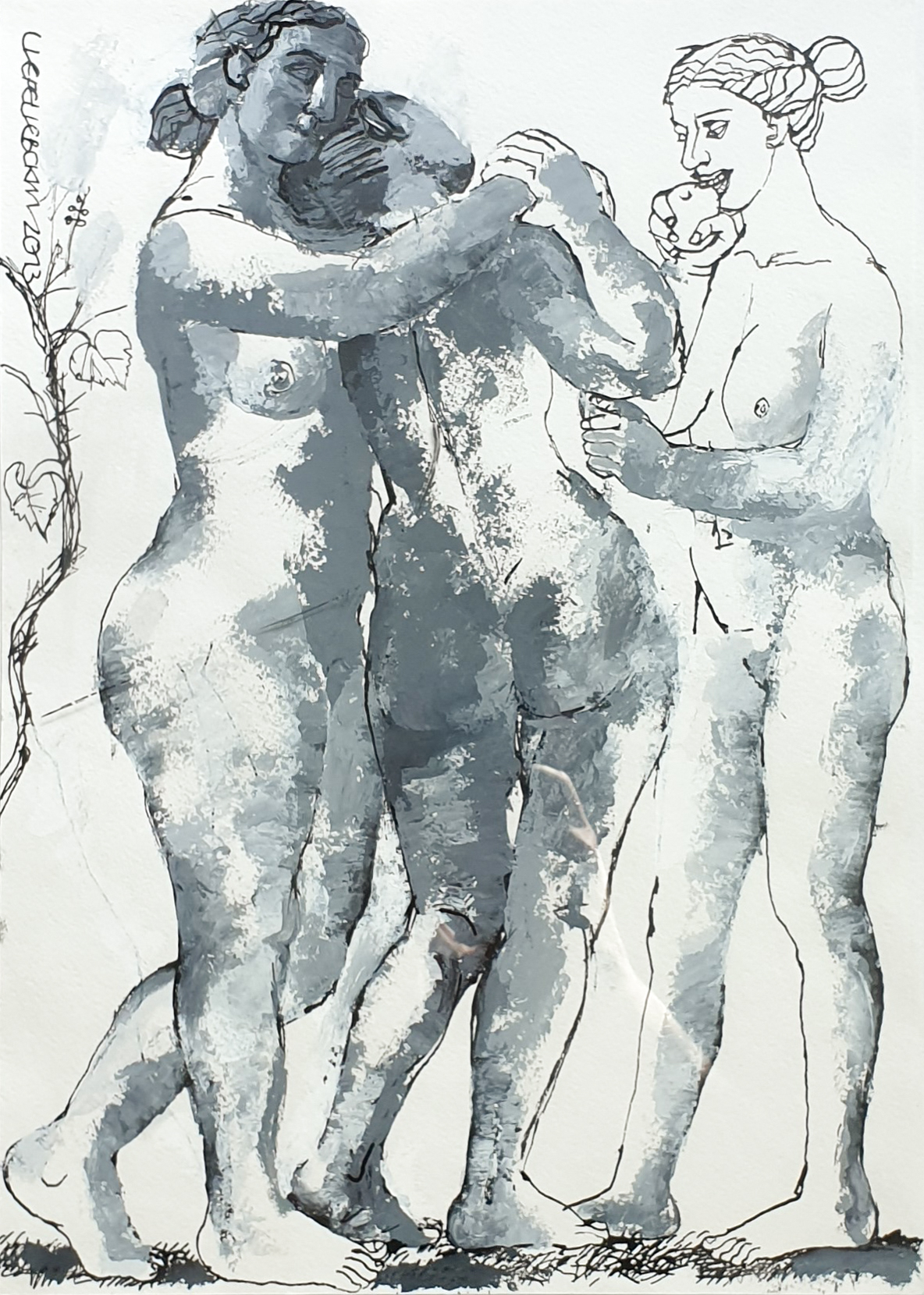 В ее графике и эмалях человек подобен вихрю в игре природных стихий, его тело гибко, невесомо, и готово к вольному соединению с другими элементами, будь то люди, цветы или животные. В ее гротескных образах чувствуется упоение языческим пантеизмом и стремление перенести нас в мифический золотой век.