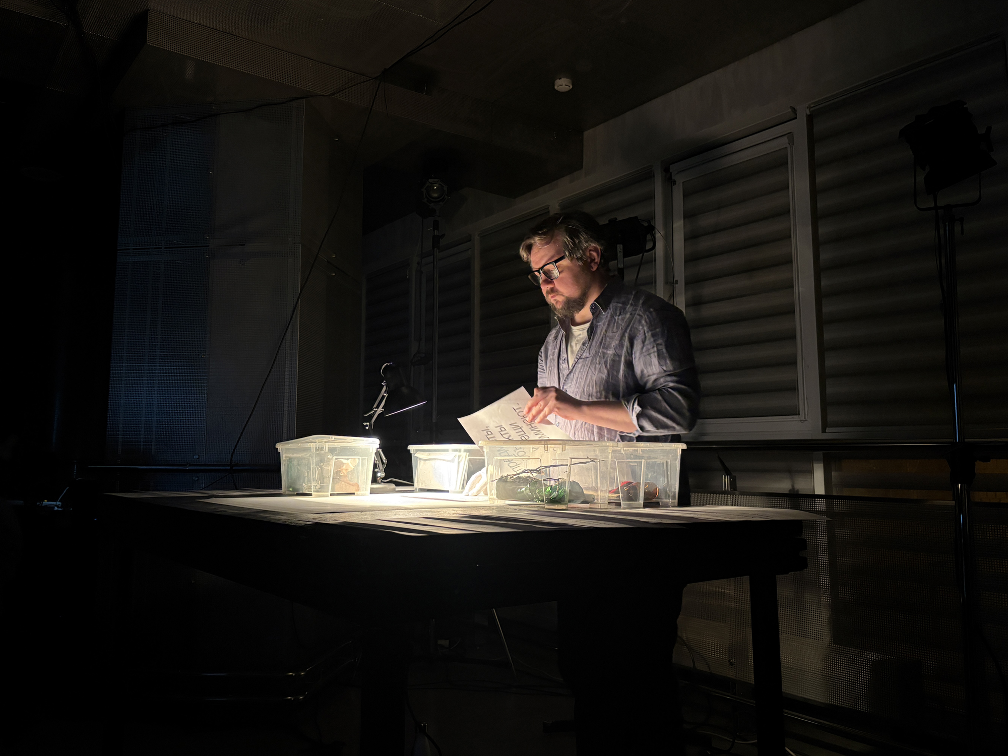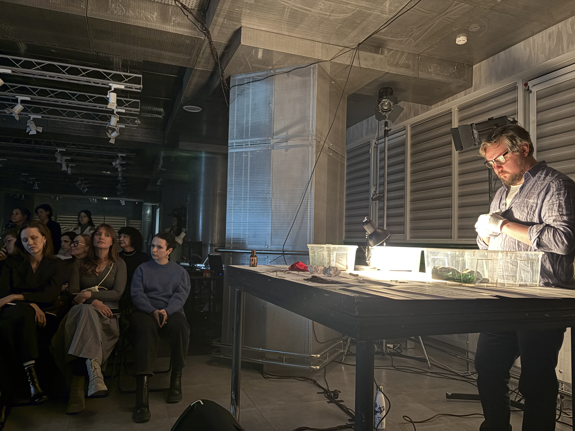 Я связался с 23 людьми, которые были и остаются важными акторами в моей профессиональной деятельности, со многими из них мы с недавнего времени разлучены, не можем работать вместе. Но вот это совмещение голосов дорогих мне людей, говорящих от имени вещей и предметов, которые не кажутся нам важными, но на самом деле составляют само существо нашей жизни, и стало тем сопряжением, которое требуется театру в моем понимании» — режиссер Дмитрий Волкострелов.